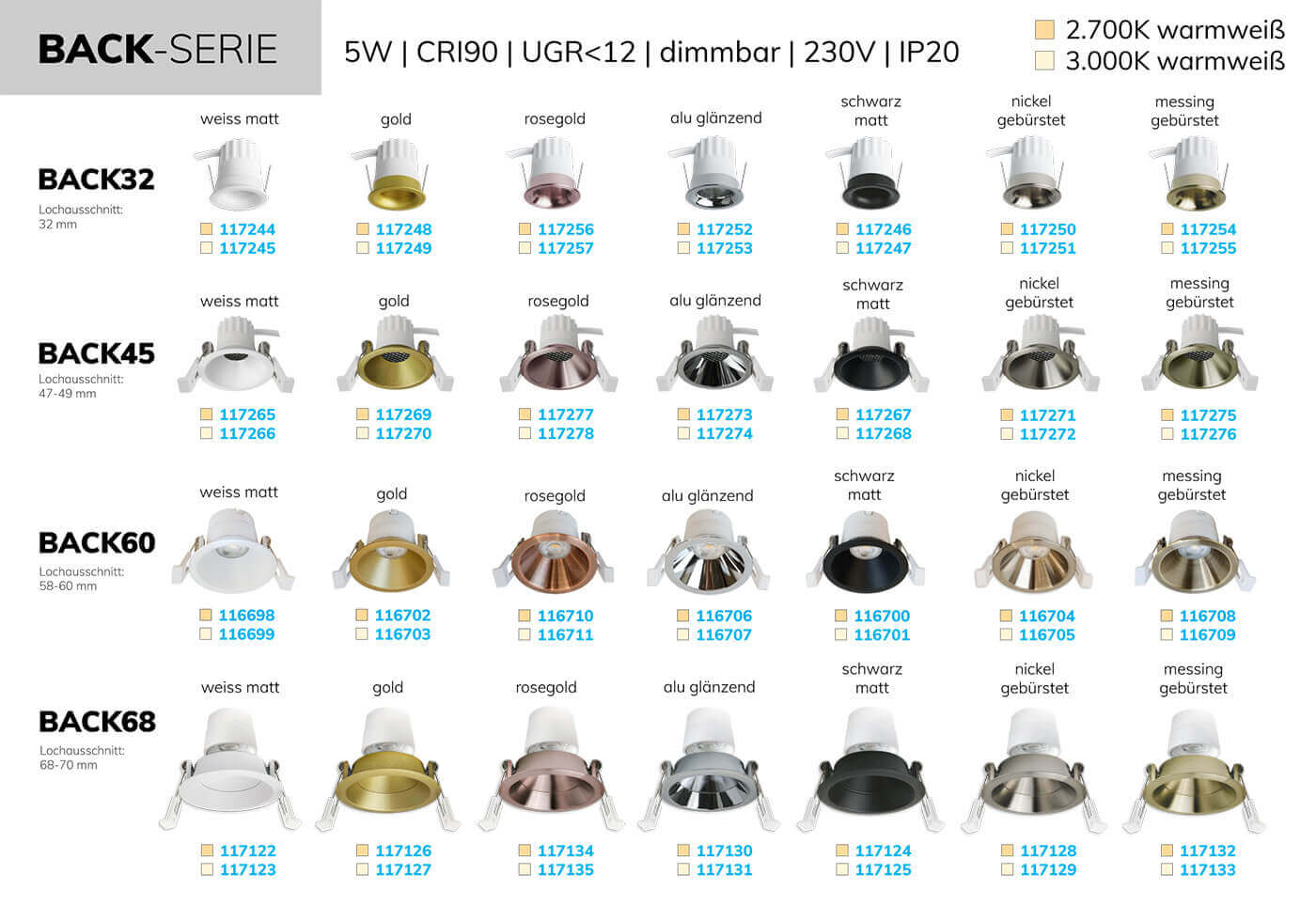 Entdecken Sie unser umfangreiches Sortiment an BACK-Einbaustrahlern. Für jedes Anwendungsgebiet den passenden Lochausschnitt.