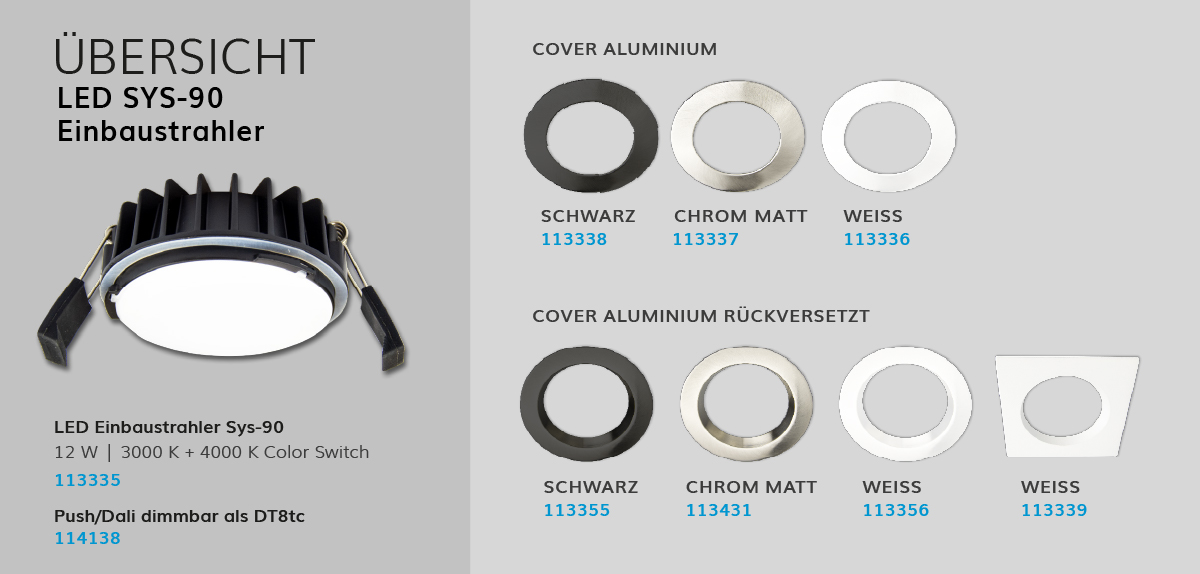 Diese LED Einbaustrahler wurden für einen Lochausschnitt von 90mm konzipiert. Beim weissdynamischen Einbaustrahler lässt sich die Farbtemperatur je nach Modell per Dipswitch oder per DALI-Szene einstellen. Ausserdem sind Sie über Push oder DALI DT8 dimmbar. Der ultraflache 24 V LED Einbaustrahler wird mit einem 1500 mm MiniAMP steckerfertigen Kabel geliefert und ist dimmbar in 3000 oder 4000 Kelvin Farbtemperatur erhältlich. Die LED SYS-90 Einbaustrahler (Lochmass 90 mm) sind mit sieben verschiedenen Abdeckungen kombinierbar.