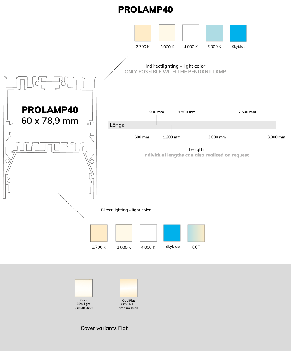 | PROLAMP30Hcri90hm surface mounted | 200616 | 45 W | silver | 1500 mm | opal+ Push/DALI dimmable | CCT | » Human Centric Lighting » White dynamic lighting |