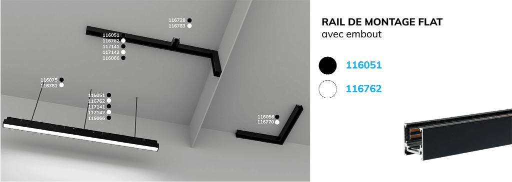 Rail en saillie, rail encastré ou rail suspendu, nous avons une solution adaptée à chaque domaine d'application. Nos différents types de rails couvrent tous les besoins. Choisissez librement votre type de montage en fonction de vos besoins. Découvrez-le maintenant !
