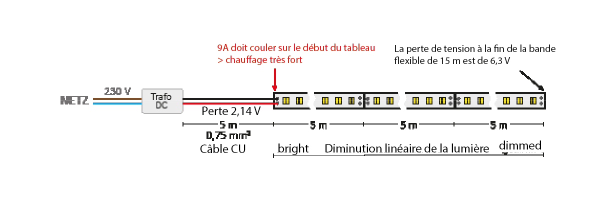 | LÄNGECÂBLE D'ALIMENTATION LONG | CHUTE/PERTE DE TENSION SUR LE CÂBLE D'ALIMENTATION EN CUIVRE CHARGE SUSPENDUE : ROULEAU DE 5 M D'UN RUBAN FLEXIBLE 24 V LED AVEC 14,4 W/M | |||||||