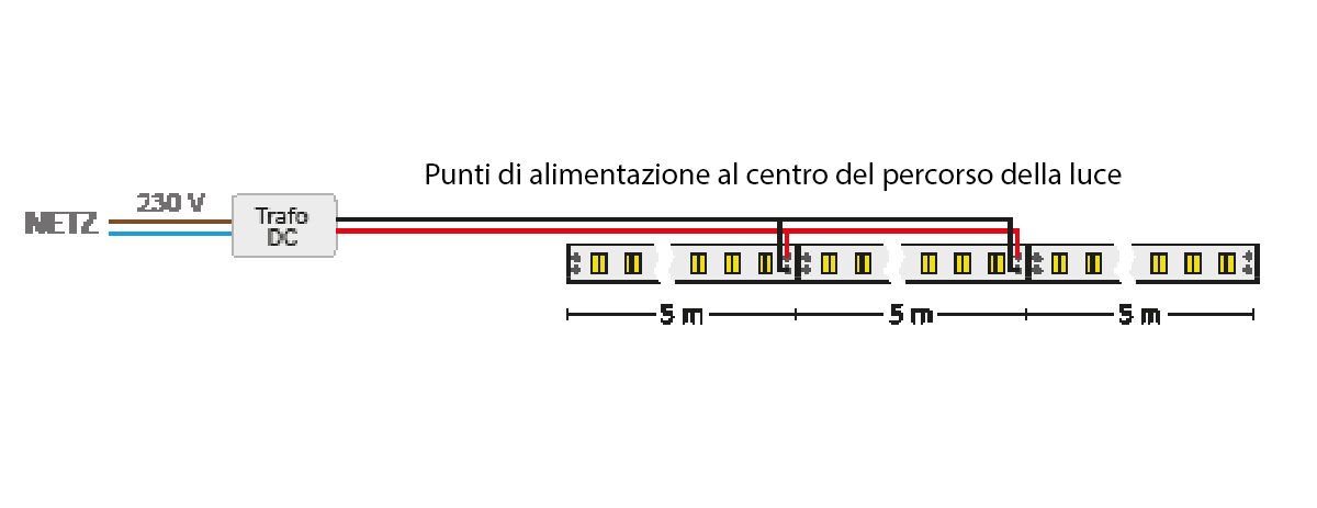 Anche se in installazioni complesse come le scale mobili il trasformatore non deve essere posizionato al centro come nel caso ideale, ma più lontano, gli schizzi seguenti descrivono le opzioni per un'alimentazione efficiente della corrente, evitando così livelli diversi di emissione luminosa su tutta la lunghezza della striscia luminosa: