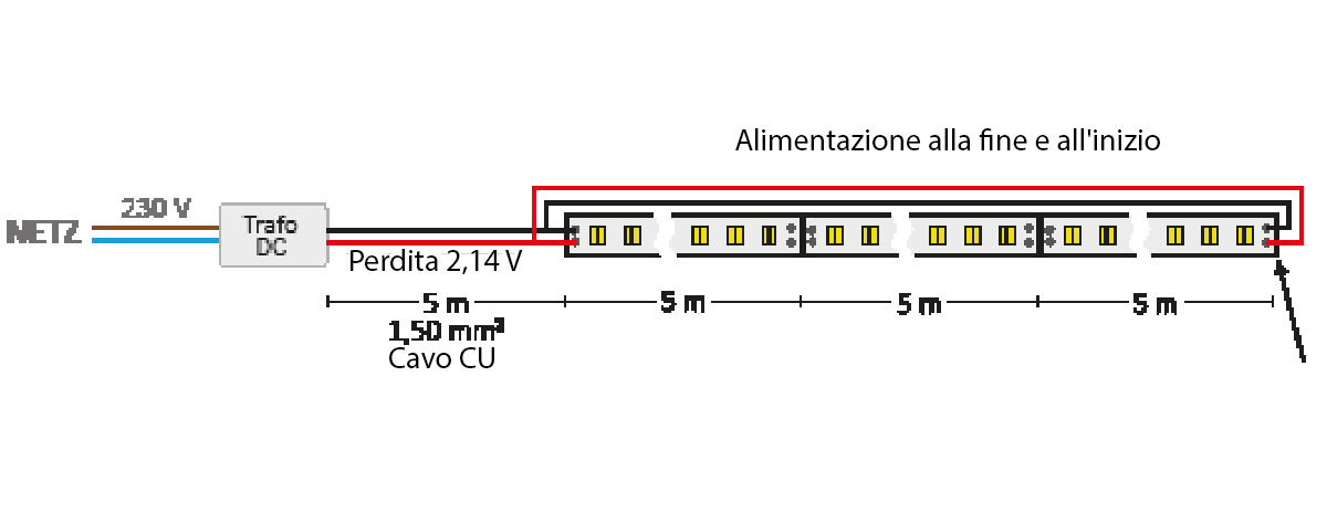 La perdita di tensione ideale quando si alimentano le strip LED dovrebbe essere inferiore al 3%, che a volte si può ottenere solo aumentando la senzioni di cavo dell'alimentazione. Alcuni trasformatori su guida DIN offrono la possibilità di aumentare la tensione di uscita fino al 10% per garantire una tensione sufficiente nel punto di alimentazione anche in caso di linee di alimentazione lunghe, ad esempio dall'armadio di distribuzione al soggiorno. Ove possibile, è consigliabile aggiungere altri punti di alimentazione per evitare perdite di tensione e di luce sull'intera linea luminosa.